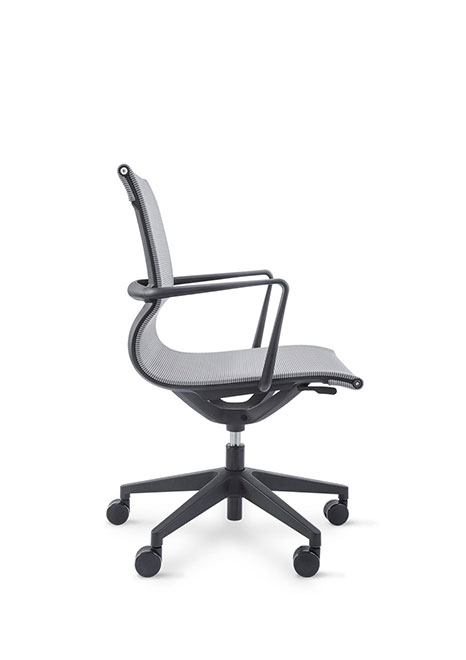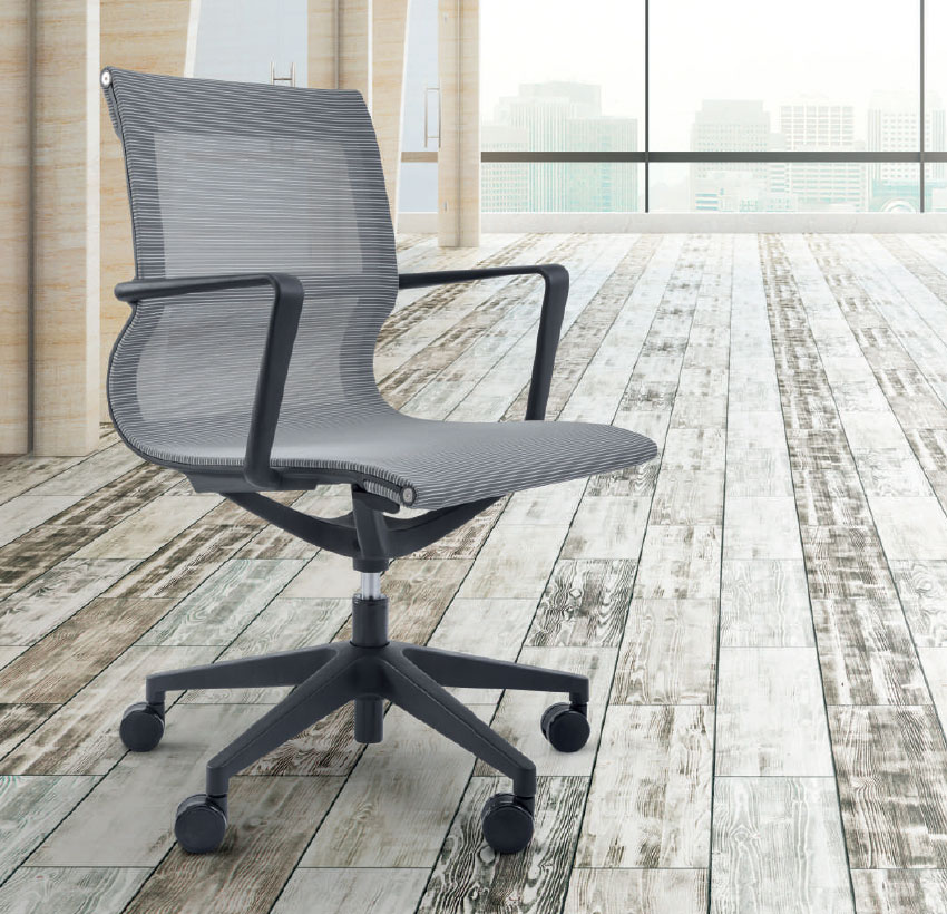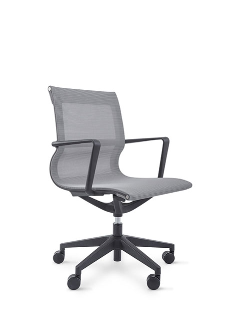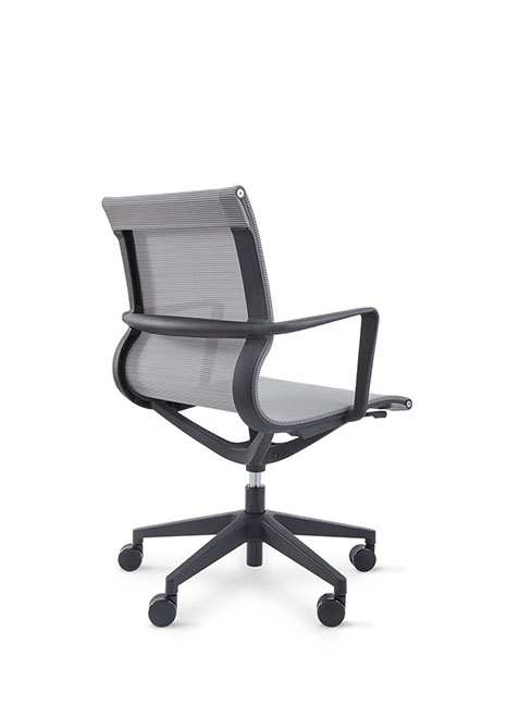 RESPALDO Y ASIENTO: Malla gris ESTRUCTURA DEL RESPALDO Y DEL ASIENTO: Nylon negro APOYABRAZOS: Fijo MECANISMO: Basculante BASE: Giratoria piramidal negra
